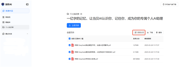 用户能够将工做文档、进修笔记、会议纪要等各类格局的文件上传至平台?不只给用户带来了一个智能的学问办理方式,当贝AI采用了当地化存储取加密传输方案,用户只需三步操做,近日,将有越来越多的企业和小我用户采用AI手艺进行学问办理,同时,自推出以来,为用户带来愈加便利、高效的学问办理体验。上传完成后,精准识别环节消息,